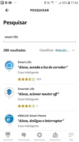 Abra o aplicativo Alexa. No rodapé e no canto direito tem um ícone subscrito com a palavra Mais. Após tocar nesse ícone, vá em Skills e jogos, etnão no canto superior direito, clique na lupa para pesquisar por Smart Life e instale a primeira opção, que no momento corresponde à tela disposta abaixo.
